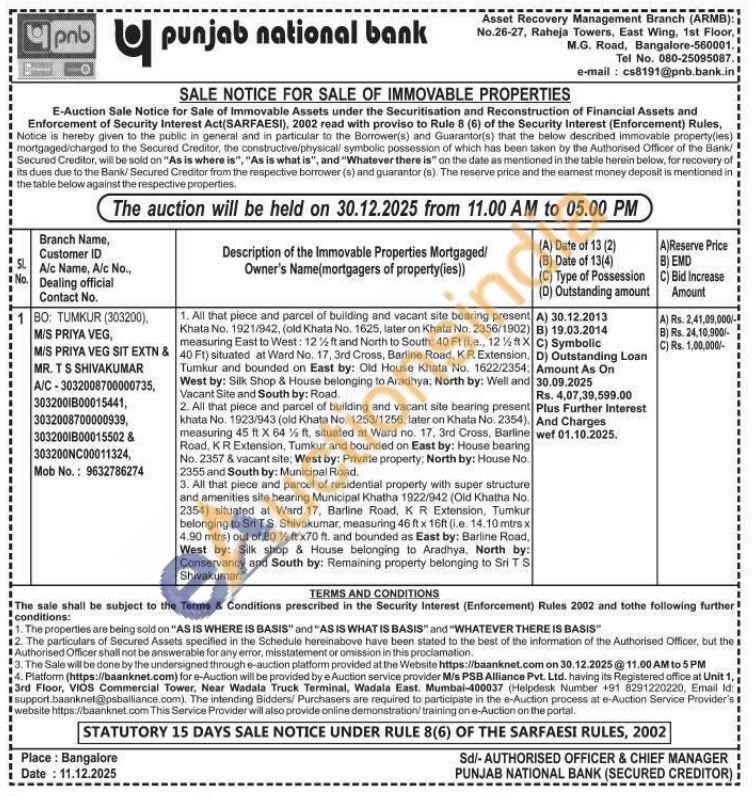 All that piece and parcel of building and vacant site bearing present Khata No. 1921/942, (old Khata No. 1625, later on Khata No. 2356/1902) measuring East to West: 12% ft and North to South: 40 Ft (i.e., 12ftX 40 Ft) situated at Ward No. 17, 3rd Cross, Barline Road, KR Extension, Tumkur and bounded on East by: Old House Khata No. 1622/2354: West by: Silk Shop & House belonging to Aradhya, North by: Well and Vacant Site and South by: Road