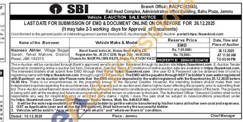Maruti Suzuki India Ltd., Brezza Smart Hybrid ZXI, Registration No. JK 20 C 5250, Regd Date: 04.06.2024, Chassis No. MA3RYHL1SRE 418278, Engine No. K15CN7434227