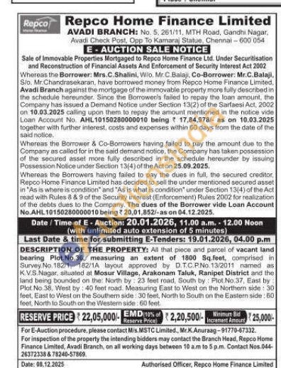 DESCRIPTION OF THE PROPERTY: All that piece and parcel of vacant land bearing Plot No.36, measuring an extent of 1800 Sq.feet, comprised in Survey No. 1821, 182/1A layout approved by D.T.C.P.No. 13/2011 named as K.V.S.Nagar, situated at Mosur Village, Arakonam Taluk, Ranipet District and the land being bounded on the North by: 23 feet road, South by Plot No 37, East by: Plot No 38. West by: 40 fent road. Measuring East to West on the Northern side: 30 feet, East to West on the Southem side: 30 feet, North to South on the Eastern side: 60 feet, North to South on the Western side: 60 feet.