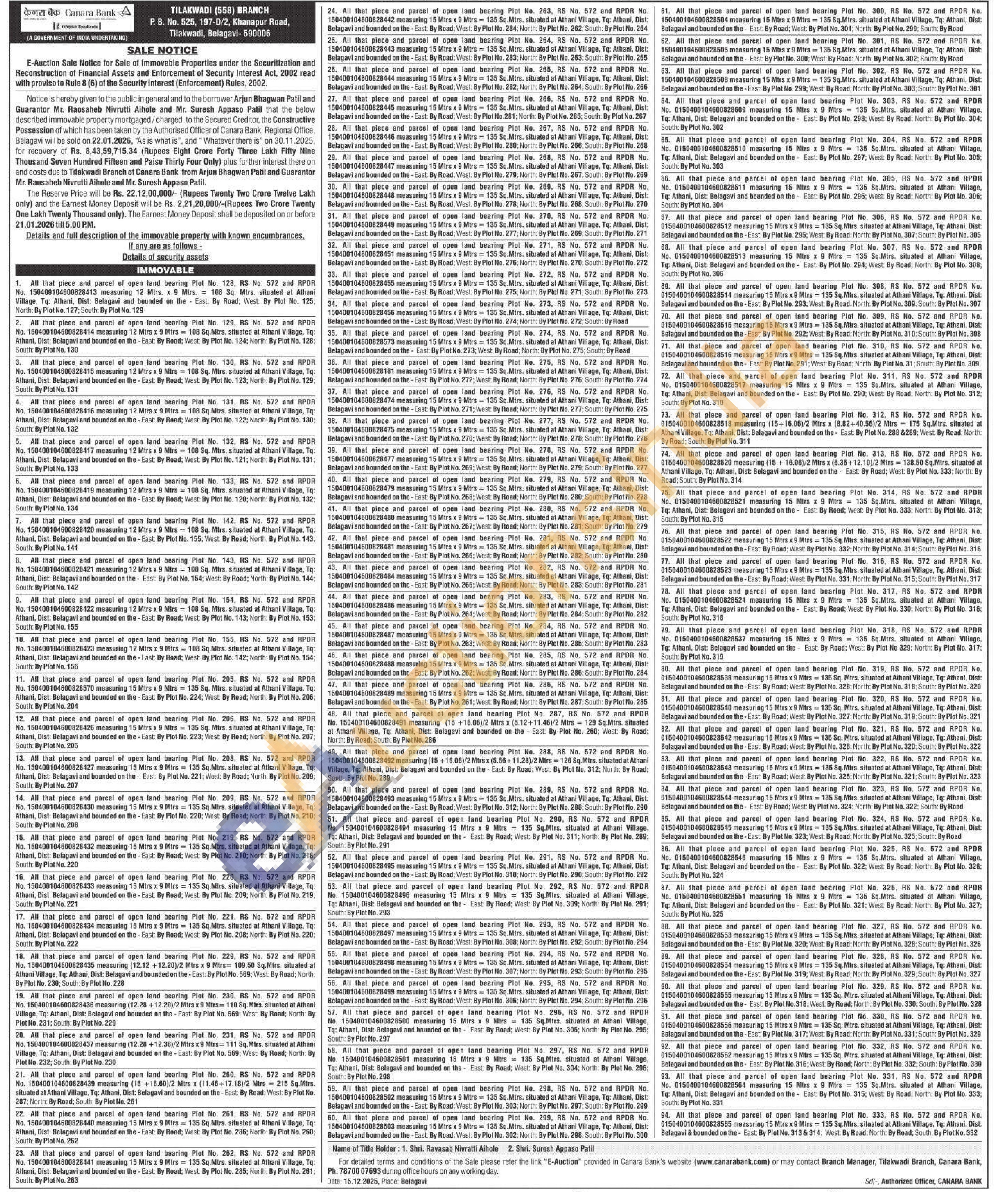 1. All that piece and parcel of open land bearing Plet No. 128, RS No. 572 and RPDR No. 150400104600828413 measuring 12 Mtrs. x 9 Mirs 108 Sq. Mirs, situated at Athani Village, Tq: Athani, Dist: Belagavi and bounded on the East: By Road: West: By Plot No. 125; North By Plot No. 127; South By Plat No. 129 2. All that piece and parcel of open land bearing Plot No. 129, RS No. 572 and RPDR No. 150400104600828414 measuring 12 Mirs x 9 Mirs 108 Sq.Mtrs. situated at Athani Village, Tq: Athani, Dist: Belagavi and bounded on the East: By Road: West. By Plet No. 124; North By Plot No. 128; South By Plot No. 130 3. All that piece and parcel of open land bearing Plot No. 130, RS No. 572 and RPDR No. 150400104600828415 measuring 12 Mtrs x 9 Mtrs 108 Sq. Mtrs. situated at Athani Village, Tq: Athani, Dist: Belagavi and bounded on the East: By Road; West. By Plet No. 123; North: By Plot No. 129: South: By Plot No. 131 4. All that piece and parcel of open land bearing Plot No. 131, RS No. 572 and RPDR No. 150400104600828416 measuring 12 Mirs x 9 Mirs 108 Sq.Mirs. situated at Athani Village, To Athani, Dist: Belagavi and bounded on the East By Road; West. By Plot No. 122; North: By Plot No. 130: South By Plot No. 132
