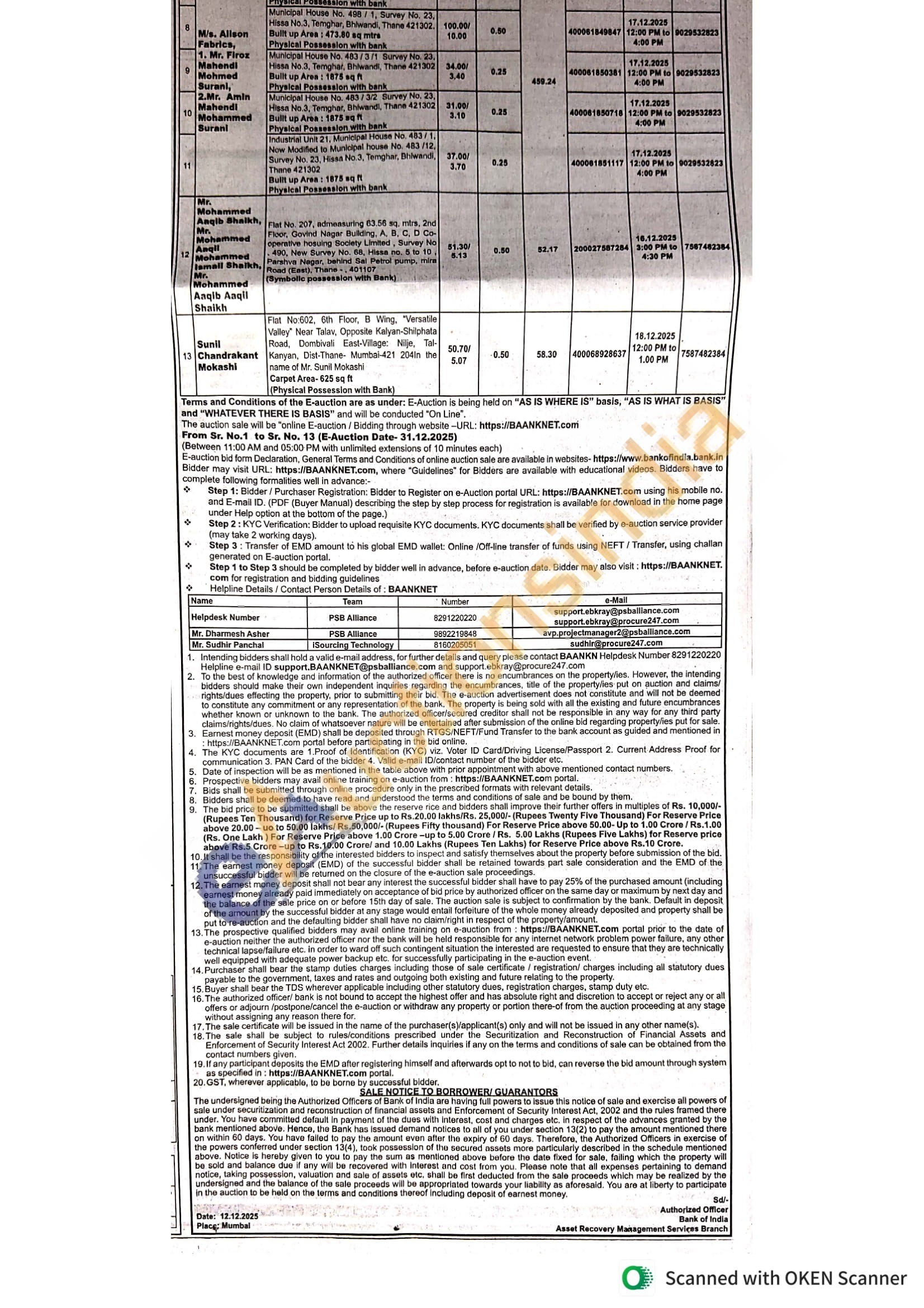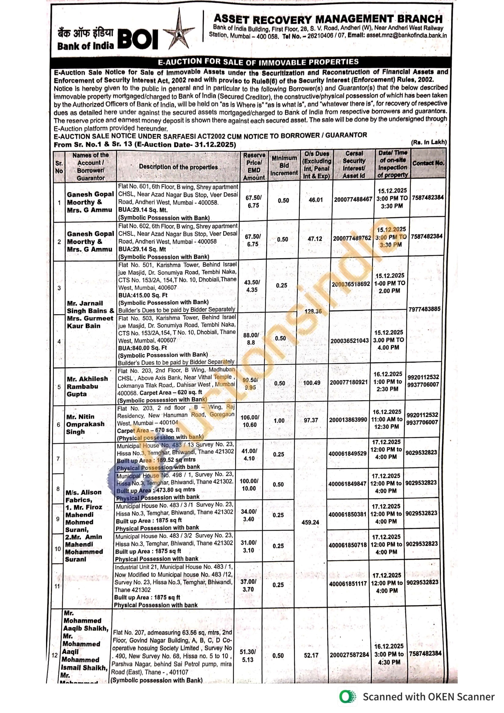 Flat No. 203, 2 nd floor B Wing, Raj Residency, New Hanuman Road, Goregaon West, Mumbai-400104 Carpet Area-670 sq. ft (Physical possession with bank)