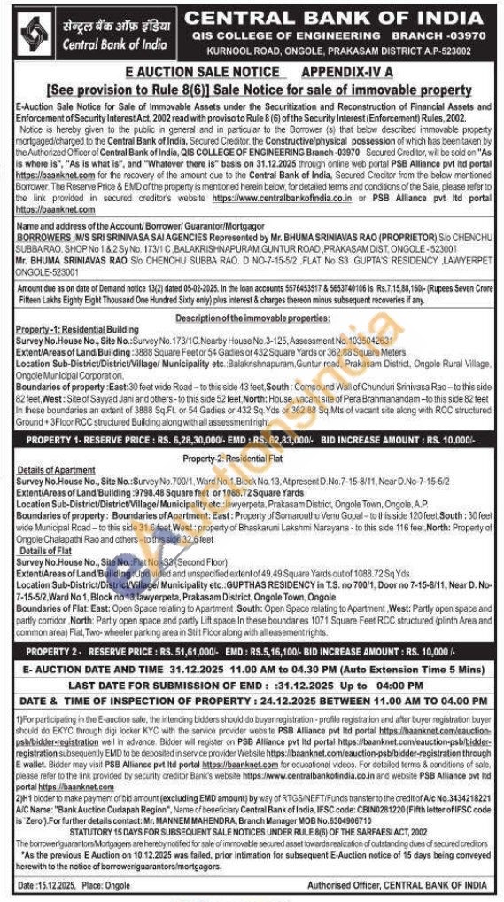 Details of Apartment Survey No.House No., Site No.: Survey No.700/1, Ward No. 1. Block No. 13. At present D No. 7-15-8/11 Near D.No-7-15-5/2 Extent/Areas of Land/Building 9798.48 Square feet or 1088.72 Square Yards Location Sub-District/District/Village/Municipality etc inwyerpeta. Prakasam District, Ongole Town. Ongole, A.P Boundaries of property: Boundaries of Apartment: East: Property of Somarouthu Venu Gopal-to this side 120 feet. South: 30 feet wide Municipal Road-to this side 31.6 feet, West: property of Bhaskaruni Lakshmi Narayana-to this side 116 feet. North: Property of Ongole Chalapathi Rao and others-to this side 32.6 feet Details of Flat Survey No.House No., Site No. Flat No.-S3 (Second Floor) Extent/Areas of Land/Building: Undivided and unspecified extent of 49.49 Square Yards out of 1088.72 SqYds Location Sub-District/District/Village/ Municipality etc. GUPTHAS RESIDENCY in T.S. no 700/1, Door no 7-15-8/11, Near D. No- 7-15-5/2, Ward No 1. Block no 13, lawyerpeta, Prakasam District, Ongole Town, Ongole Boundaries of Flat East: Open Space relating to Apartment South: Open Space relating to Apartment West: Partly open space and partly comidor North: Partly open space and partly Lift space in these boundaries 1071 Square Feet RCC structured (plinth Area and common area) Flat Two-wheeler parking area in Stilt Floor along with all easement rights