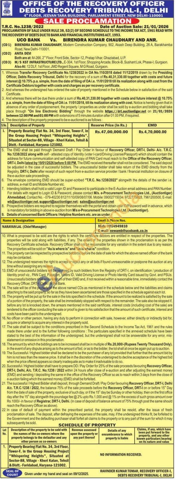 Property Bearing Flat No. 34, 3rd Floor, Tower-F, in the Group Housing Project "Whispering Heights", Situated at Sector-88, Village Kheri Kalan, Tehsil & Distt.-Faridabad, Haryana-121002.