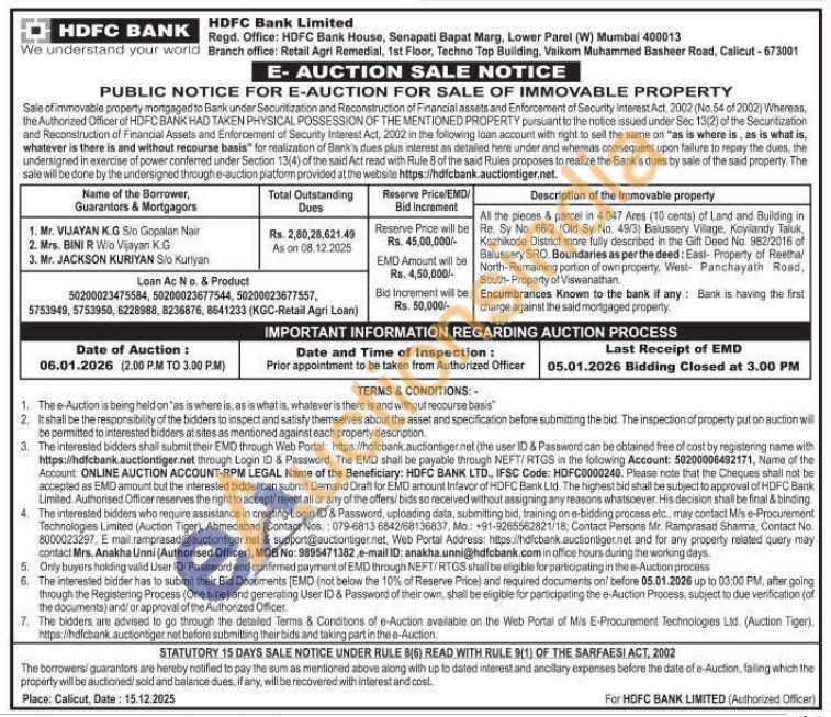 All the pieces & parcel in 4.047 Ares (10 cents) of Land and Building in Re. Sy No. 66/2 (Old Sy No. 49/3) Balussery Village, Koyilandy Taluk, Kozhikode District more fully described in the Gift Deed No. 982/2016 of Balussery SRO. Boundaries as per the deed: East- Property of Reethal North-Remaining portion of own property, West- Panchayath Road, South-Property of Viswanathan. Encumbrances Known to the bank if any Bank is having the first charge against the said mortgaged property.