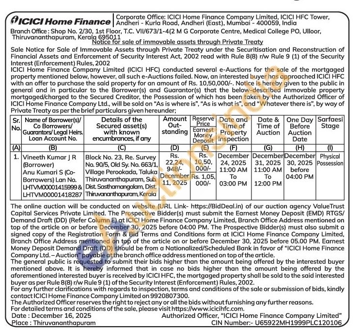 Block No. 23, Re. Survey No. 90/5, Old Sy. No. 663/1, Village Perookada, Taluka Thiruvananthapuram, Sub. Dist. Sasthamangalam, Dist. Thiruvananthapuram, Kerala