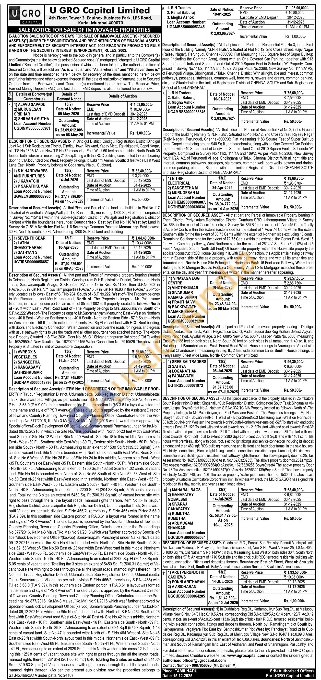 Description of Secured Asset(s): All that part and Parcel of Immovable property bearing in Dindigul district, Vedasundar Taluk, Palani Registration District, Vadamadurai Sub Registration District, Ayyalur Town Panchayat, Ayyalur Village, S No. 608/5 New S.No. 608/43 (as per Patta No, 6006) measuring East West 38 feet on both sides, North South 30 feet on both sides in all measuring 1140 sq. ft. and Builiding in it Bounded as on East- Forest Road West- House belongs to Arumugam, Vacant site sold out Chandrasekar measuring 870 sq. ft., 2 feet wide common Lane, South- House belongs to Periyasamy, 3 feet wide Lane, North- Common Cement Road