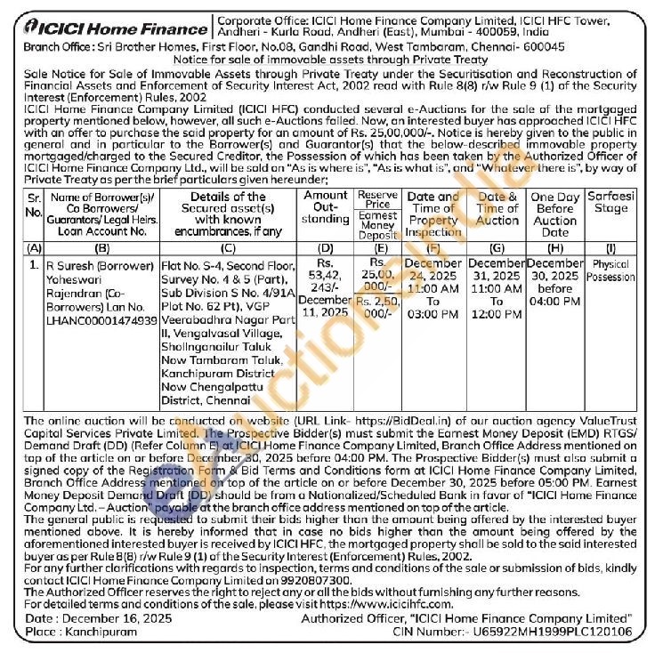 Flat No. S-4, Second Floor, Survey No. 4 & 5 (Part). Sub Division S No. 4/91A Plot No. 62 Pt), VGP Veerabadhra Nagar Part II, Vengalvasal Village, Sholinganailur Taluk Now Tambaram Taluk Kanchipuram District Now Chengalpattu District, Chennai