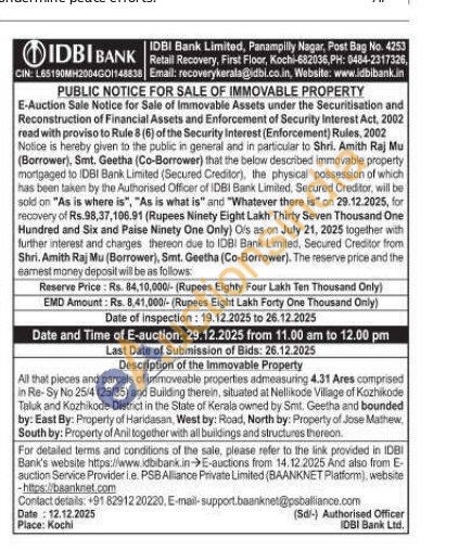 All that pieces and parcels of immoveable properties admeasuring 4.31 Ares comprised in Re-Sy No 25/4 (25/35) and Building therein, situated at Nellikode Village of Kozhikode Taluk and Kozhikode District in the State of Kerala owned by Smt. Geetha and bounded by: East By: Property of Haridasan, West by: Road, North by: Property of Jose Mathew, South by: Property of Anil together with all buildings and structures thereon.