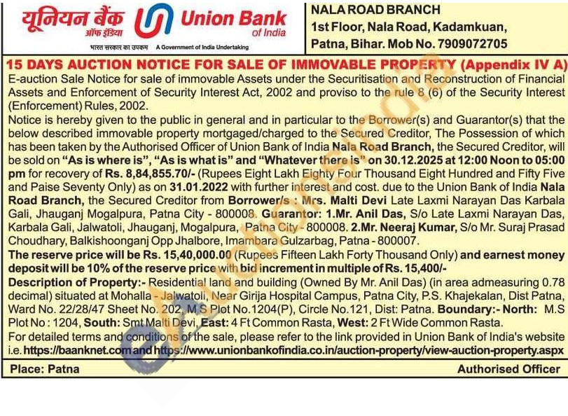 Description of Property:- Residential land and building (Owned By Mr. Anil Das) (in area admeasuring 0.78 decimal) situated at Mohalla - Jalwatoli, Near Girija Hospital Campus, Patna City, P.S. Khajekalan, Dist Patna, Ward No. 22/28/47 Sheet No. 202, M S Plot No.1204(P), Circle No. 121, Dist: Patna. Boundary:-North: M.S Plot No: 1204, South: Smt Malti Devi, East: 4 Ft Common Rasta, West: 2 Ft Wide Common Rasta
