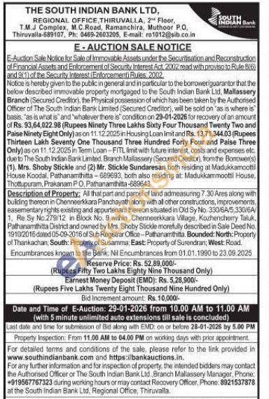All that part and parcel of land admeasuring 7.30 Ares along with building thereon in Chenneerkkara Panchayath along with all other constructions, improvements, easementary rights existing and appurtenant thereon situated in Old Sy No. 330/6A/5,330/6A/1. Re Sy No.279/12 in Block No. 9 within Chenneerkkara Village, Kozhencherry Taluk Pathanamthitta District and owned by Mrs. Shoby Stickle morefully described in Sale Deed No 1910/2016 dated 05-09-2016 of Sub Registrar Office-Pathanamthitta. Bounded: North: Property of Thankachan, South: Property of Susamma, East: Property of Surendran; West: Road. Encumbrances known to the Bank: Nil Encumbrances from 01.01.1990 to 23.09.2025