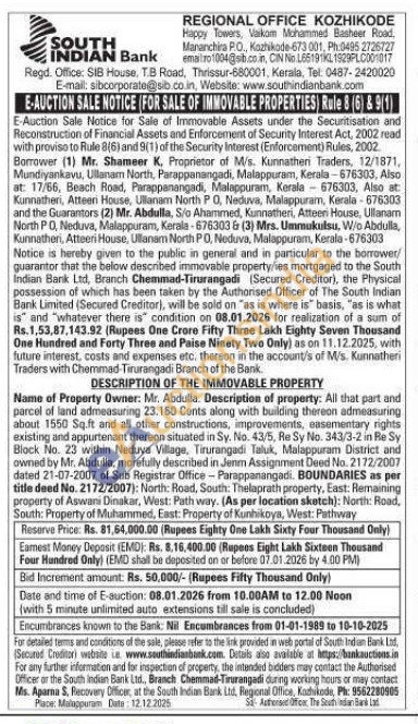 All that part and parcel of land admeasuring 23.150 Cents along with building thereon admeasuring about 1550 Sq.ft and all other constructions, improvements, easementary rights existing and appurtenant thereon situated in Sy. No. 43/5, Re Sy No. 343/3-2 in Re Sy Block No. 23 within Neduva Village, Tirurangadi Taluk, Malappuram District and owned by Mr. Abdulla, morefully described in Jenm Assignment Deed No. 2172/2007 dated 21-07-2007 of Sub Registrar Office-Parappanangadi, BOUNDARIES as per title deed No. 2172/2007): North: Road, South: Thelaprath property, East: Remaining property of Aswani Dinakar, West: Path way. (As per location sketch): North: Road, South: Property of Muhammed, East: Property of Kunhikoya, West: Pathway