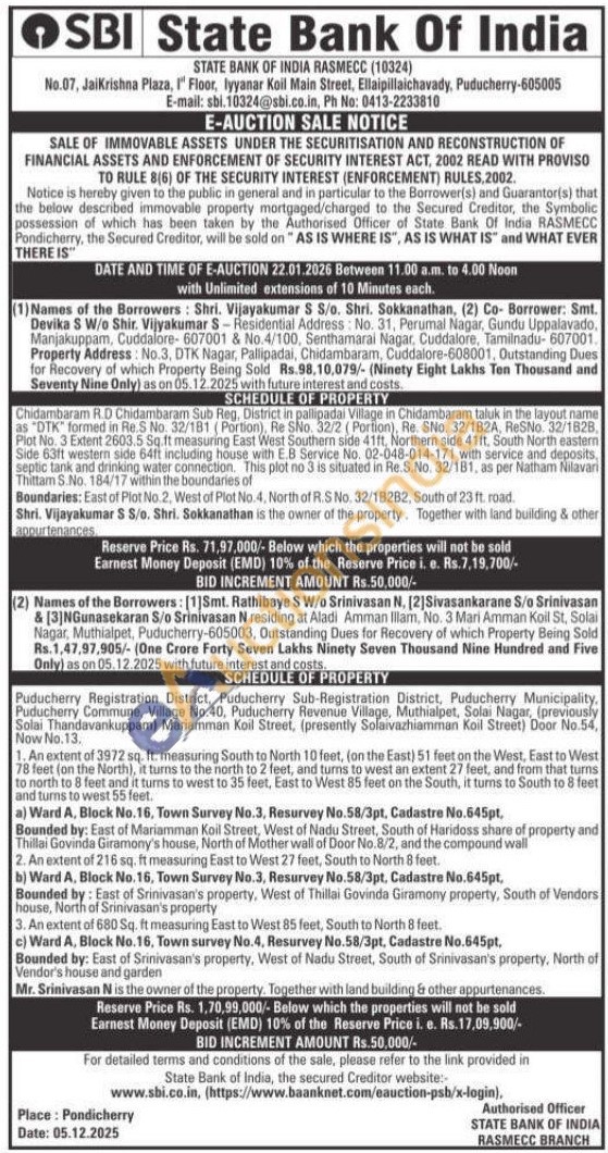 SCHEDULE OF PROPERTY : Puducherry Registration District, Puducherry Sub-Registration District, Puducherry Municipality, Puducherry Commune, Village No.40, Puducherry Revenue Village, Muthialpet, Solai Nagar, (previously Solai Thandavankuppam) Mariamman Koil Street, (presently Solaivazhiamman Koil Street) Door No.54, Now No. 13.