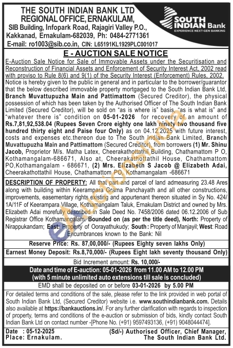 DESCRIPTION OF PROPERTY: All that part and parcel of land admeasuring 23.48 Ares along with building within Keerampara Grama Panchayath and all other constructions, improvements, easementary rights existing and appurtenant thereon situated in Sy No. 424/1A/11F of Keerampara Village, Kothamangalam Taluk, Ernakulam District and owned by Mrs. Elizabeth Adai morefully described in Sale Deed No. 7458/2006 dated 06.12.2006 of Sub Registrar Office Kothamangalam. Bounded on (as per the title deed), North: Property of Nirappukandam; East: Property of Oorayathukudy; South: Property of Manjayil; West: Road