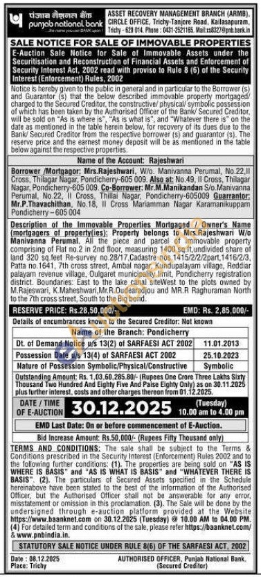 Description of the Immovable Properties Mortgaged / Owner's Name (mortgagers of property(ies): Property belongs to Mrs. Rajeshwari W/o Manivanna Perumal. All the piece and parcel of immovable property comprising of Flat no.2 in 2nd floor, measuring 1400 sq.ft, undivided share of land 320 sq.feet Re-survey no.28/17, Cadastre nos. 1415/2/2/2part, 1416/2/3, Patta no. 1641, 7th cross street, Ambal nagar, Kundupalayam village, Reddiar palayam revenue village, Oulgaret municipality limit, Pondicherry registration district. Boundaries: East to the lake canal siteWest to the plots owned by M.Rajeswari, K.Maheshwari, Mr. R. Oudearadjou and MR.R Raghuraman North to the 7th cross street, South to the Big bond