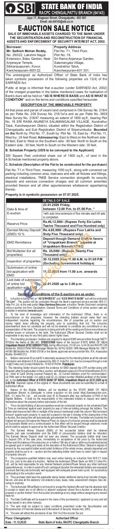 Flat No. T1 in Third Floor, measuring 1050 sq.ft., along with convered car parking including common area, staircase and with all fixtures and fittings, electrical installations, TNEB Service connection alongwith its security deposits and services connection charges and all common amenities provided thereon and all other appurtenances whatsoever appertaining thereto