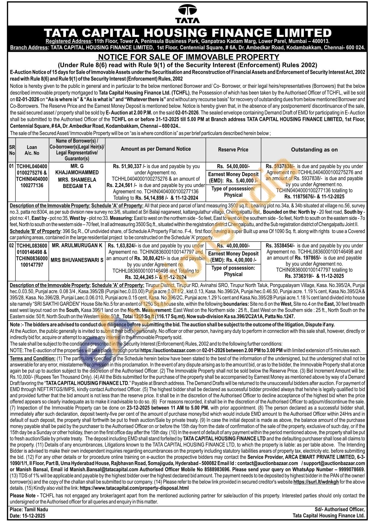 All that piece and parcel of land measuring 3500 sq.ft., bearing plot no.34a, & 34b situated at village no.56, survey no.3, patta no:8304, as per sub division new survey no:3/6, situated at Sri Balaji nagarwest, kattangulathur village, Chengalpattu dist.. Bounded on the: North by -20 feet road, South by-plot no: 41, East by-pot no:35, West by-plot no:33. Measuring: East to west on the northern side-50 feet, East to west on the southern side-50 feet, North to south on the eastern side-70 feet, North to south on the westem side-70 feet, In all admeasuring 3500 Sq.ft., situated within the registration district Chengalpattu, and the Sub registration district of Chengalpattu Joint II. Schedule 'B' of Property: 396 Sq. R., Of undivided share, of Schedule A Property Fiat no. F-4, first floor, having a super Built up area Of 1090 Sq. ft. along with rights to use a Covered car parking areas, contained in the large residential project to be constructed on the Schedule 'A' property.