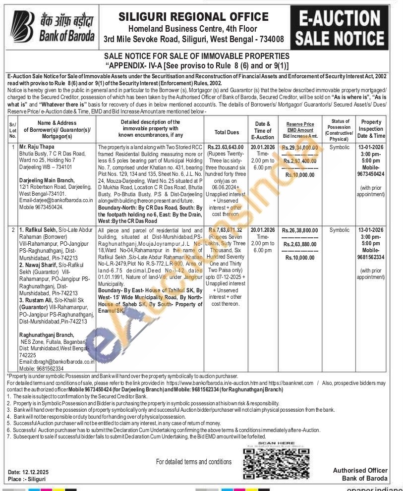 The property is a land along with Two Storied RCC framed Residential Building measuring more or less 6.5 poles bearing part of Municipal Holding No. 7, comprised under Khatian no. 431, bearing Plot Nos. 129, 134 and 135, Sheet No. 6, J.L. No. 24. Mouza-Darjeeling, Ward No. 25 situated at P D Mukhia Road, Location CR Das Road, Bhutia Busty, Po-Bhutia Busty, P.S & Dist-Darjeeling alongwith building thereon present and future. Boundary-North: By CR Das Road, South: By the footpath holding no 6, East: By the Drain, West: By the CR Das Road