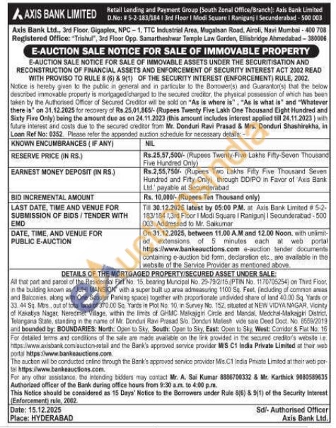 All that part and parcel of the Residential Flat No. 15, bearing Muncipal No. 25-79/2/15 PTIN No. 1170705254) on Third Floor, in the building known as "JUHI MANSION with a super built up area admeasuring 1100 Sq. Feet, (including of common areas and Balconies, along with One Scooter Parking space) together with proportionate undivided share of land 40.00 Sq. Vands or 33.44 Sq. Mers, out of total land of 370.00 50. Yards in Plot No. 10, in Survey No. 152. situated at NEW VIDYA NAGAR, Vicinity of Kakatiya Nagar. Neredmet Village, within the limits of GHMC Malkajigin Circle and Mandal, Medchal-Malkajgiri District, Telangana State, standing in the name of Mr. Donduli Ravi Prasad Sio. Donduri Matesh vide sale Deed Doct. No. 8559/2019 and bounded by: BOUNDARIES: North: Open to Sky, South: Open to Sky, East: Open to Sky, West: Corridor & Flat No. 16