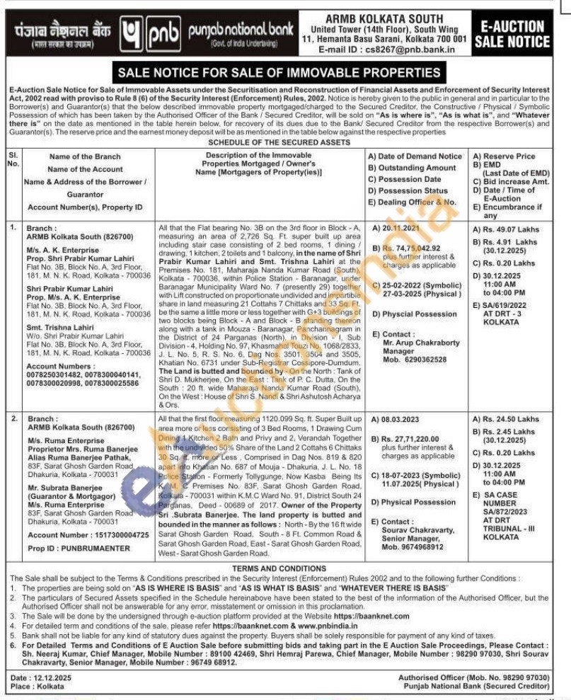 All that the first floor measuring 1120.099 Sq. ft. Super Built up area more or less consisting of 3 Bed Rooms, 1 Drawing Cum Dining 1 Kitchen 2 Bath and Privy and 2, Verandah Together with the undivided 50% Share of the Land 2 Cottahs 6 Chittaks 30 Sq. ft. more or Less Comprised in Dag Nos. 819 & 820 apart into Khatian No. 687 of Mouja Dhakuria, J. L. No. 18 Police Station-Formerly Tollygunge, Now Kasba Being Its K. M. C Premises No. 83F, Sarat Ghosh Garden Road, Kolkata-700031 within K.M.C Ward No. 91. District South 24 Parganas, Deed-00689 of 2017. Owner of the Property Sri Subrata Banerjee. The land property is butted and bounded in the manner as follows: North-By the 16 ft wide Sarat Ghosh Garden Road, South-8 FL. Common Road & Sarat Ghosh Garden Road, East-Sarat Ghosh Garden Road, West-Sarat Ghosh Garden Road.