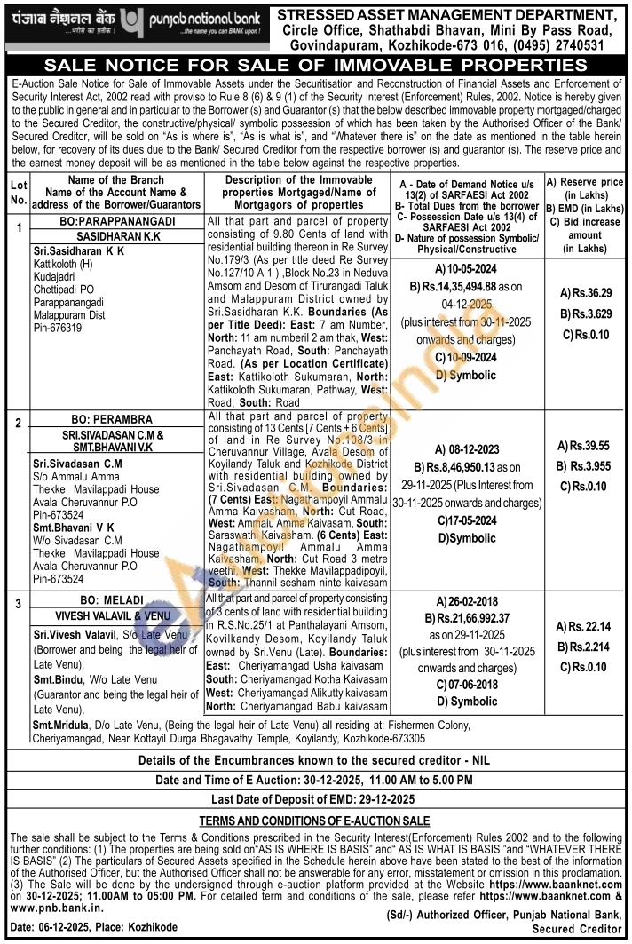 All that part and parcel of property consisting of 13 Cents [7 Cents + 6 Cents] of land in Re Survey No. 108/3 in Cheruvannur Village, Avala Desom of Koyilandy Taluk and Kozhikode District with residential building owned by Sri. Sivadasan C.M. Boundaries: (7 Cents) East: Nagathampoyil Ammalu Amma Kaivasham, North: Cut Road, West: Ammalu Amma Kaivasam, South: Saraswathi Kaivasham. (6 Cents) East: Nagathampoyil Ammalu Amma Kaivasham, North: Cut Road 3 metre veethi, West: Thekke Mavilappadipoyil, South: Thannil sesham ninte kaivasam