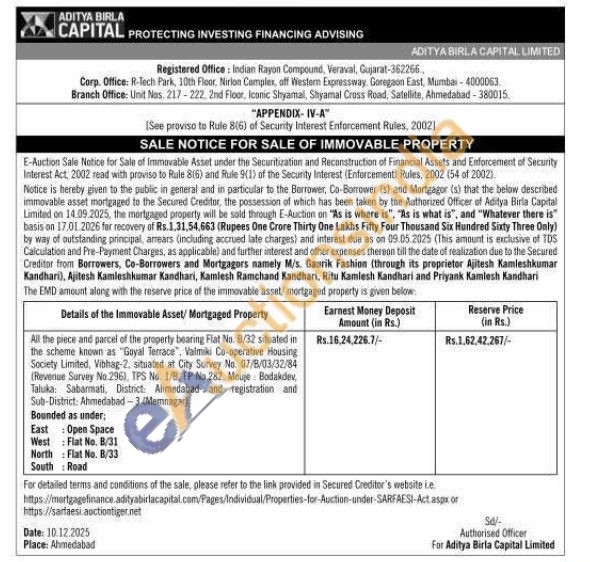 All the piece and parcel of the property bearing Flat No. 8/32 situated in the scheme known as "Goyal Terrace", Valmiki Co-operative Housing Society Limited, Vibhag-2, situated at City Survey No. 07/8/03/32/84 (Revenue Survey No 296), TPS No. 1/B, FP No.282. Mouje Bodakdev, Taluka: Sabarmati, District: Ahmedabad and registration and Sub-District: Ahmedabad-3 (Memnagar) Bounded as under; East: Open Space West Flat No. B/31 North Flat No. B/33 South Road