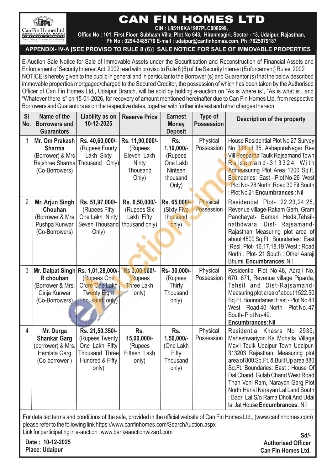 Residential Khasra No 2939, Maheshwariyon Ka Mohalla Village Mavli Taulk Udaipur Town Udaipur-313203 Rajasthan. Measuring plot area of 800 Sq. Ft. & Built Up area 880 Sq.Ft. Boundaries: East: House Of Dal Chand, Gulab Chand West: Road Than Veni Ram, Narayan Garg Plot North:Harlal Narayan Lal Land South : Badri Lal S/o Rama Dholi And Udai lal Jat House Encumbrances: Nil