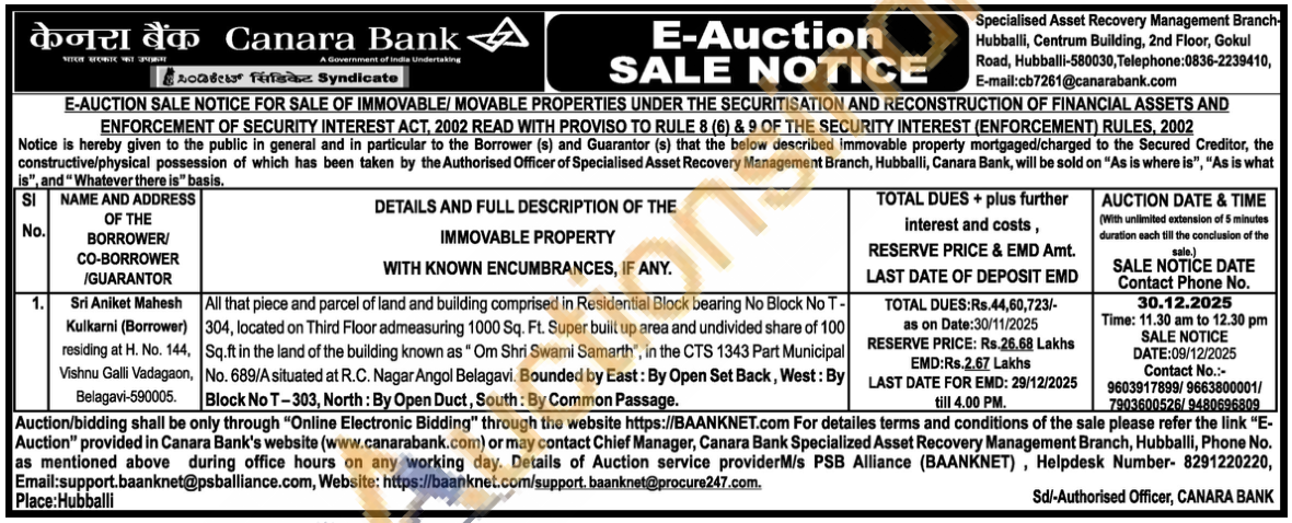 All that piece and parcel of land and building comprised in Residential Block bearing No Block No T-304, located on Third Floor admeasuring 1000 Sq. Ft. Super built up area and undivided share of 100 Sq.ft in the land of the building known as "Om Shri Swami Samarth", in the CTS 1343 Part Municipal No. 689/A situated at R.C. Nagar Angol Belagavi. Bounded by East: By Open Set Back, West: By Block No T-303, North: By Open Duct, South: By Common Passage.