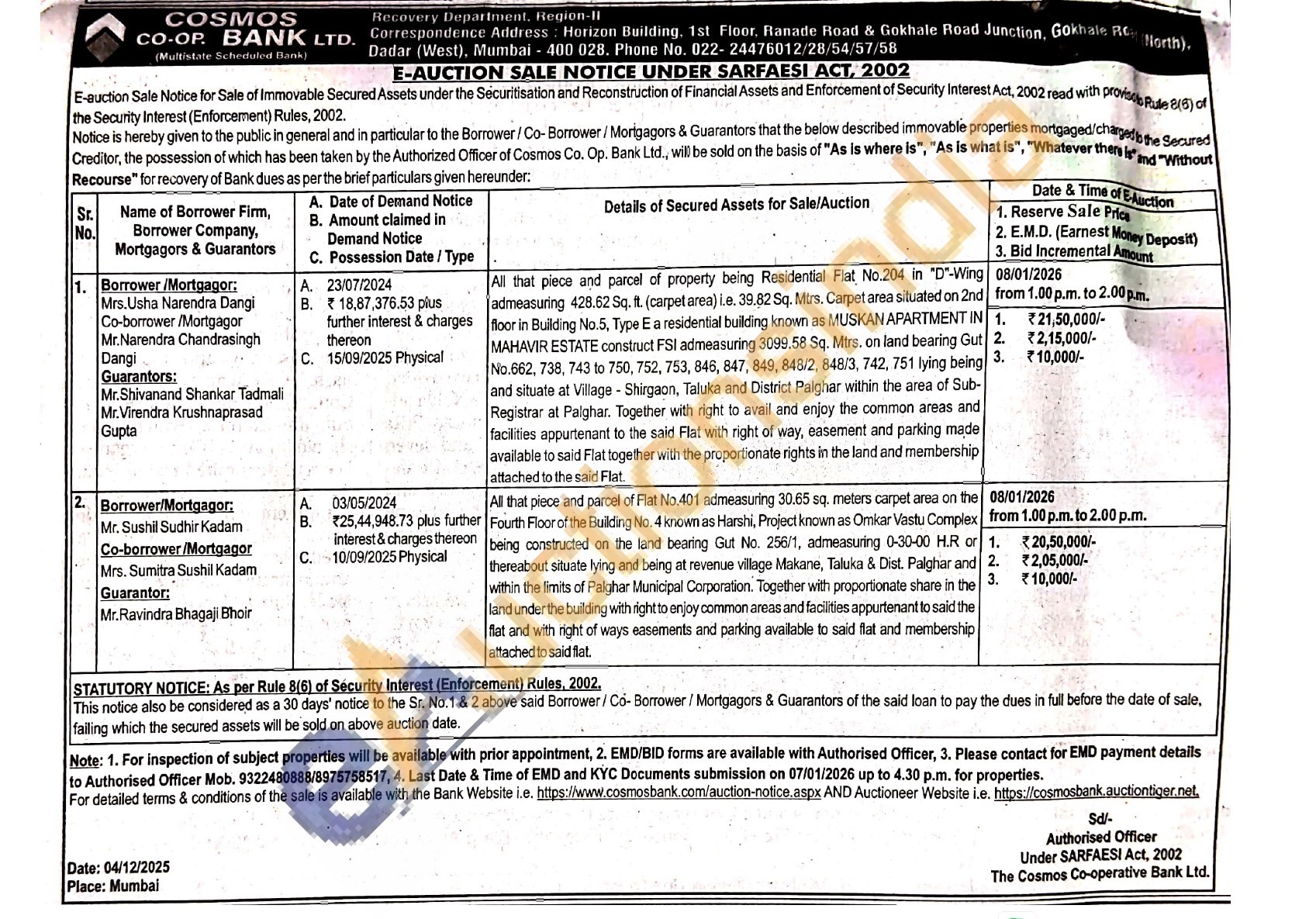 Authorised Officer Mob. 9322480888/8975758517
