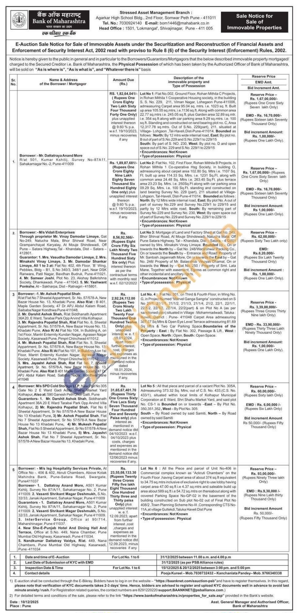 Lot No 5: All that piece and parcel of a vacant Plot No. 305A, Admeasuring 373.32 Sq. Mirs, out of C.S. No. 433, (C.S. No. 433/1), situated within local limits of Kolhapur Municipal Corporation at E Ward, Shri Shahu Market Yard, and said plot No CS-1 is Bounded on or towards -East By Plot No. 350,351,352, West-By Plot No. 305 South By Road owned by said Samiti, North By Road owned by said Samiti Encumbrances: Not Known Type of possession: Physical