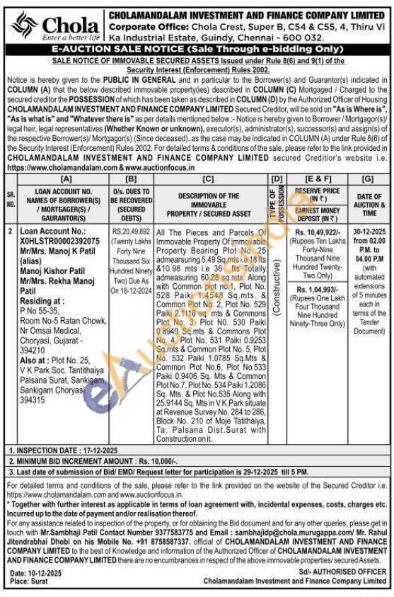 All The Pieces and Parcels Of Immovable Property Of immovable Property Bearing Plot No. 25 admearsuring 5.49 Sq.mts i.e 18 fts &10.98 mts ie 36 fts Totally admeasuring 60.28 sq.mts. Along with Common plot no.1, Plot No. 528 Paiki 1.4548 Sq.mts. & Common Plot No. 2, Plot No. 529 Paiki 2.1116 sq. mts & Commons Plot No. 3, Plot NO. 530 Paiki 0.8949 Sq.mts & Commons Plot No. 4, Plot No. 531 Paiki 0.9253 Sq.mts & Common Plot No. 5, Plot No. 532 Paiki 1.0785 Sq.Mts & Common Plot No.6. Plot No.533 Paiki 0.9406 Sq. Mts & Common Plot No. 7. Plot No. 534 Paiki 1,2086 Sq. Mts. & Plot No.535 Along with 25.9144 Sq. Mts in V.K.Park situate at Revenue Survey No. 284 to 286, Block No. 210 of Moje Tatithaiya, Ta. Palsana Dist. Surat with Construction on