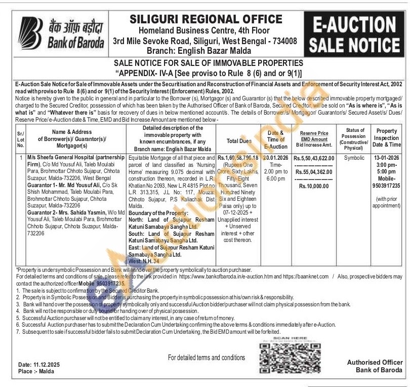 Equitable Mortgage of all that piece and parcel of land classified as "Nursing Home measuring 9.075 decimal with construction thereon, recorded in L.R. Khatian No 2093, New L.R 4815 Plot no L.R 313,315, JL No: 117, Mouza: Chhoto Sujapur, P.S Kaliachak Dist Malda. Boundary of the Property: North: Land of Sujapur Resham Katuni Samabaya Sangha Ltd. South: Land of Sujapur Resham Katuni Samabaya Sangha Ltd. East: Land of Sujapur Resham Katuni Samabaya Sangha Ltd. West: N.H. 34