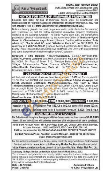 All that part and parcel of vacant land to an extent 12,052 sq.ft comprised in TS. No. 85/2 Part, 85/1C4 part, situated at Arunagiri Road & Selva Vinayagar Koil Street, Arunagiri Chathiram, Madhavarayanpettal, Arni Town & Taluk, Tiruvannamalai Dt. Bounded: On the North by: Land in T.S.No. 85/3, On the South by: Arunagiri Road. On the East by: Millers Road. On the West by: Property comprised in T.S.Nos.86/2, 84/1, 84/2 & 84/3, owned by G Sinivasan, G Mahadevan, M.Dhanapal and N Baskar, Block No.E19