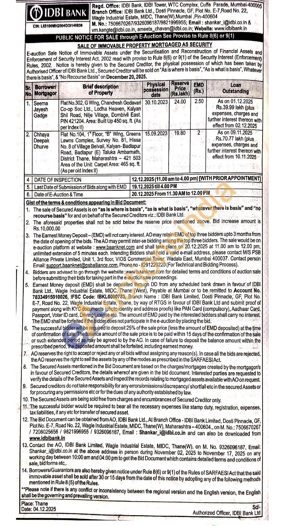 Flat No.302, G Wing, Chandresh Godavari Co-op Soc Ltd., Lodha Heaven, Kalyan Shill Road, Nije Village, Dombivli East. PIN 421204. Area: Built Up 450 sq. ft. (As per Index