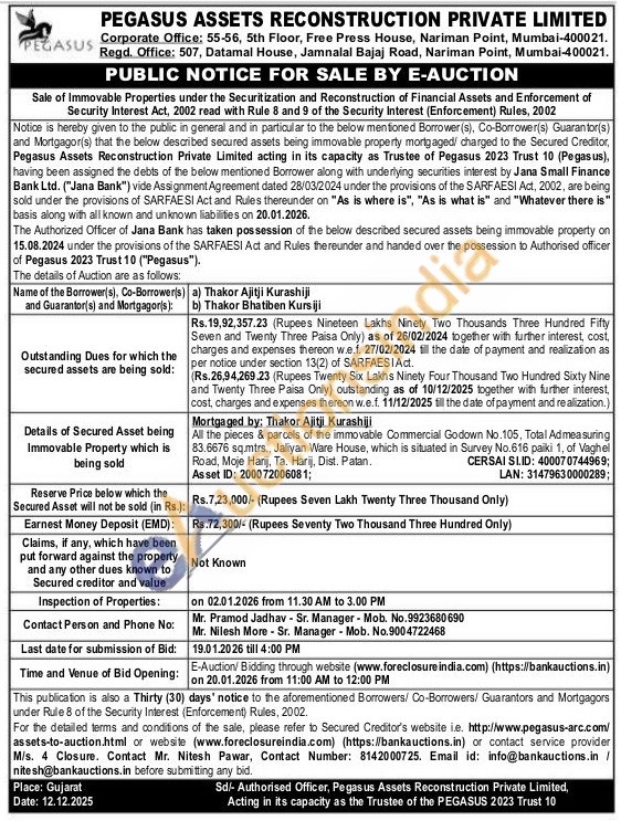 Mortgaged by: Thakor Ajitji Kurashiji All the pieces & parcels of the immovable Commercial Godown No.105, Total Ad measuring 83.6676 sq.mtrs., Jaliyan Ware House, which is situated in Survey No.616 paiki 1, of Vaghel Road, Moje Harij, Ta. Harij, Dist. Patan