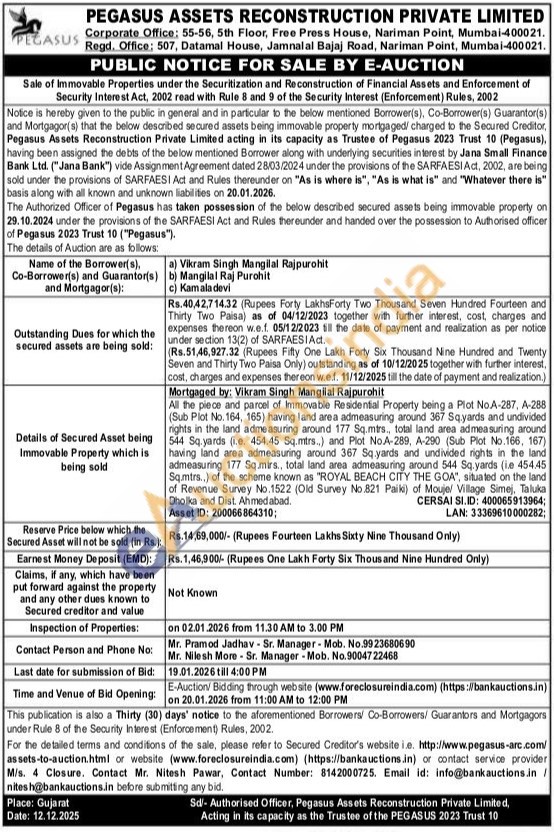 Mortgaged by: Vikram Singh Mangilal Rajpurohit : All the piece and parcel of Immovable Residential Property being a Plot No.A-287, A-288 (Sub Plot No. 164, 165) having land area admeasuring around 367 Sq.yards and undivided rights in the land admeasuring around 177 Sq.mtrs., total land area admeasuring around 544 Sq.yards (i.e. 454.45 Sq.mtrs..) and Plot No.A-289, A-290 (Sub Plot No.166, 167) having land area admeasuring around 367 Sq yards and undivided rights in the land admeasuring 177 Sq.mtrs., total land area admeasuring around 544 Sq.yards (ie 454.45 Sq.mtrs.,) of the scheme known as "ROYAL BEACH CITY THE GOA", situated on the land of Revenue Survey No.1522 (Old Survey No 821 Paiki) of Mouje/ Village Simej, Taluka Dholka and Dist. Ahmedabad.