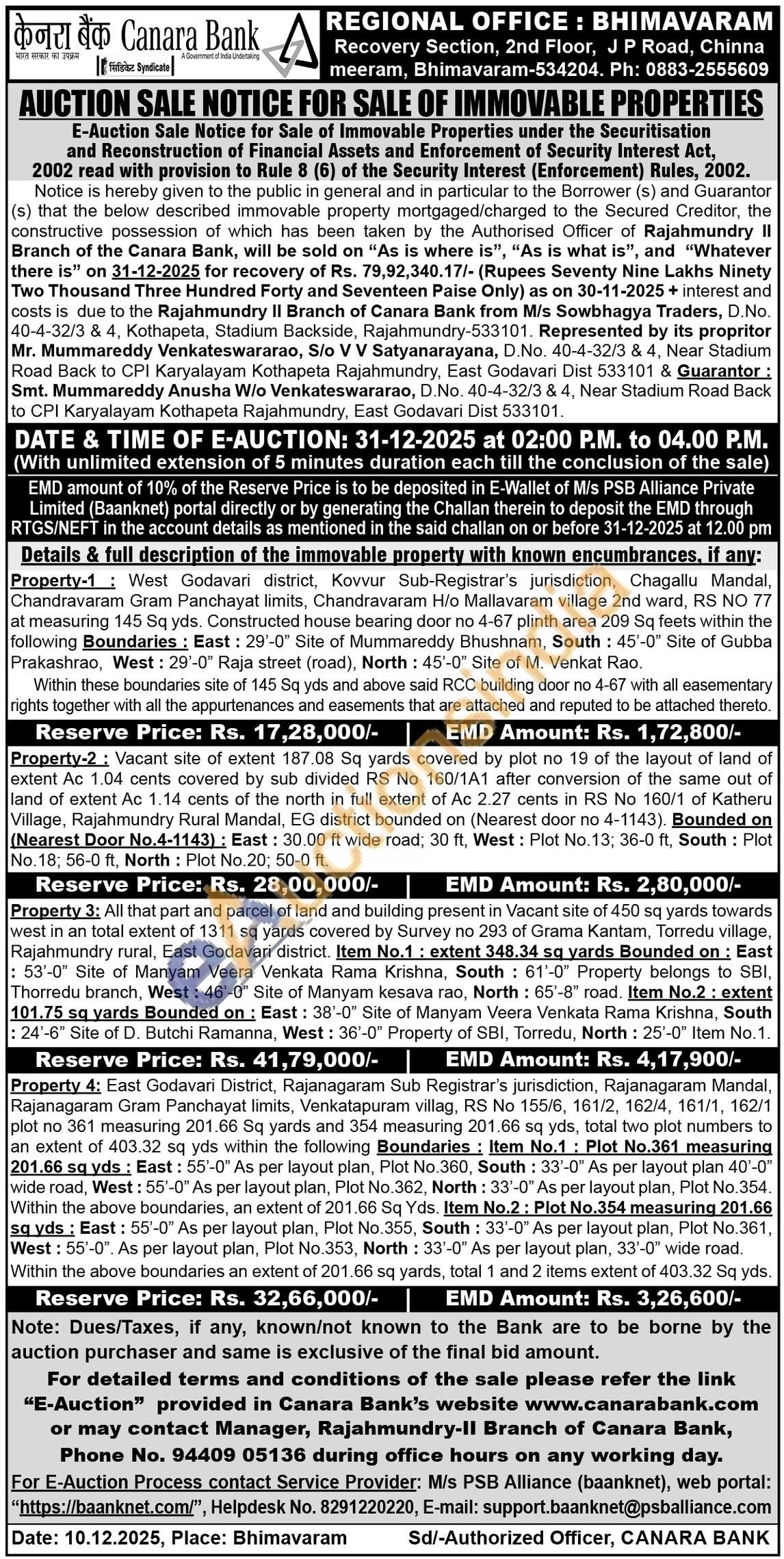 Property 3: All that part and parcel of land and building present in Vacant site of 450 sq yards towards west in an total extent of 1311 sq yards covered by Survey no 293 of Grama Kantam, Torredu village, Rajahmundry rural, East Godavari district. Item No.1: extent 348.34 sq yards Bounded on: East 53-0" Site of Manyam Veera Venkata Rama Krishna, South: 61-0" Property belongs to SBI, Thorredu branch, West: 46-0" Site of Manyam kesava rao, North: 65'-8" road. Item No.2: extent 101.75 sq yards Bounded on: East: 38-0" Site of Manyam Veera Venkata Rama Krishna, South : 24'-6" Site of D. Butchi Ramanna, West: 36-0" Property of SBI, Torredu, North: 25-0" Item No. 1.
