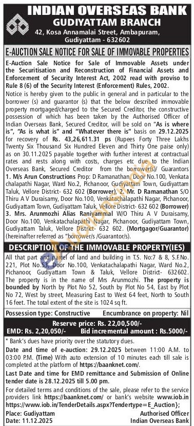 All that part and parcel of land and building in T.S. No:7 & 8, S.F.No. 221, Plot No.53, Door No.100, Venkatachalapathi Nagar, Ward No.2, Pichanoor, Gudiyattam Town & Taluk, Vellore District- 632602. The property is in the name of Mrs Arunmozhi. The property is bounded by North by Plot No 52, South by Plot No 54, East by Plot No 72, West by street, Measuring East to West 64 feet, North to South 16 feet. The total extent of the site is 1024 sq ft