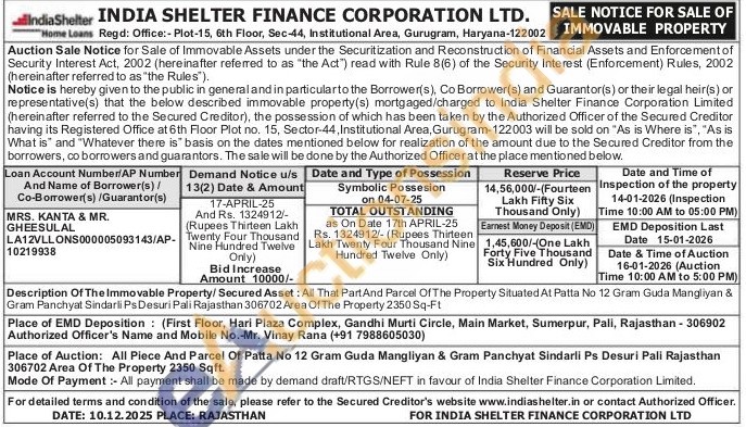 Description Of The Immovable Property/Secured Asset: All That Part And Parcel Of The Property Situated At Patta No 12 Gram Guda Mangliyan & Gram Panchyat Sindarli Ps Desuri Pali Rajasthan 306702 Area Of The Property 2350 Sq-Ft