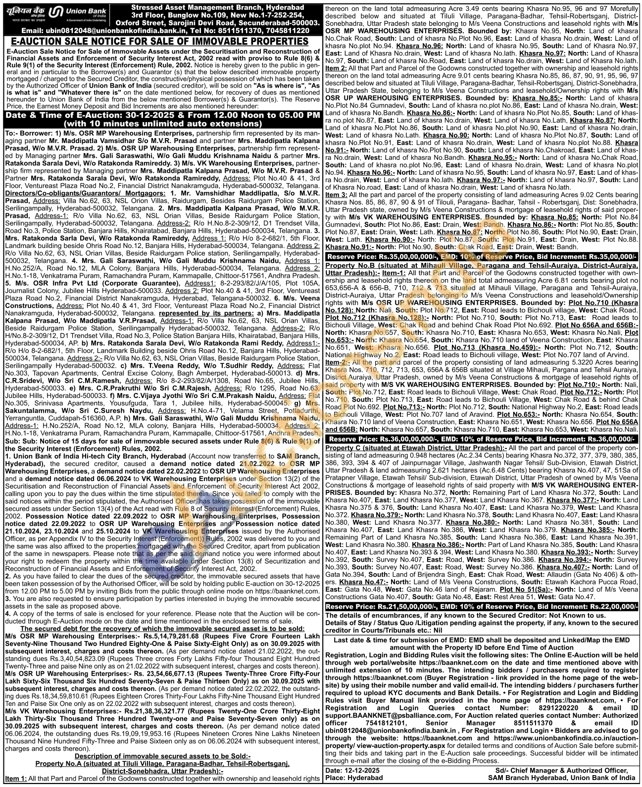 Property C (situated at Etawah District, Uttar Pradesh):- All the part and parcel of the property con-sisting of land admeasuring 0.948 hectares (Ac.2.34 Cents) bearing Khasra No.372, 377, 379, 380, 385, 386, 393, 394 & 407 of Jainpurnagar Village, Jashwanth Nagar Tehsil/ Sub-Division, Etawah District. Uttar Pradesh & land admeasuring 2.621 hectares (Ac.6.48 Cents) bearing Khasra No.407, 47, 51Sa of Pratapner Village, Etawah Tehsil/ Sub-division, Etawah District, Uttar Pradesh of owned by M/s Veena Constructions & mortgage of leasehold rights of said property with M/S VK WAREHOUSING ENTER-PRISES. Bounded by: Khasra No.372, North: Remaining Part of Land Khasra No.372, South: Land Khasra No.407, East: Land Khasra No.377, West: Land Khasra No.367. Khasra No.377:- North: Land Khasra No.375 & 376, South: Land Khasra No.407, East: Land Khasra No.379, West: Land Khasra No.372. Khasra No.379:- North: Land Khasra No.378, South: Land Khasra No.407, East: Land Khasra No.380, West: Land Khasra No.377. Khasra No.380:- North: Land Khasra No.381, South: Land Khasra No.407, East: Land Khasra No.386, No.386, West: West: Land Land Khasra Khasra No.379. Khasra No.385:- North: Remaining Part of Land Khasra No.385, South: Land Khasra No.386, East: Land Khasra No.391. West: Land Khasra No.380. Khasra No.386:- North: Part of Land Khasra No.385, South: Land Khasra No.407, East: Land Khasra No.393 & 394, West: Land Khasra No. 380. Khasra No.393:- North: Survey No.392. South: Survey No.407, East: Road, West: Survey No.386. Khasra No.394:- North: Survey No.393. South: Survey No.407, East: Road, West: Survey No.386. Khasra No.407:- North: Land of Gata No.394, South: Land of Brijendra Singh, East: Chak Road, West: Allaudin (Gata No 408) & oth ers. Khasra No.47:- North: Land of Mis Veena Constructions, South: Etawah Kachora Pucca Road, East: Gata No.48, West: Gata No.46 land of Rajaram. Plot No 51(Sa): North: Land of Mis Veena Constructions Gata No.407, South: Gata No.48, East: Rest Area 51, West: Gata No.47.
