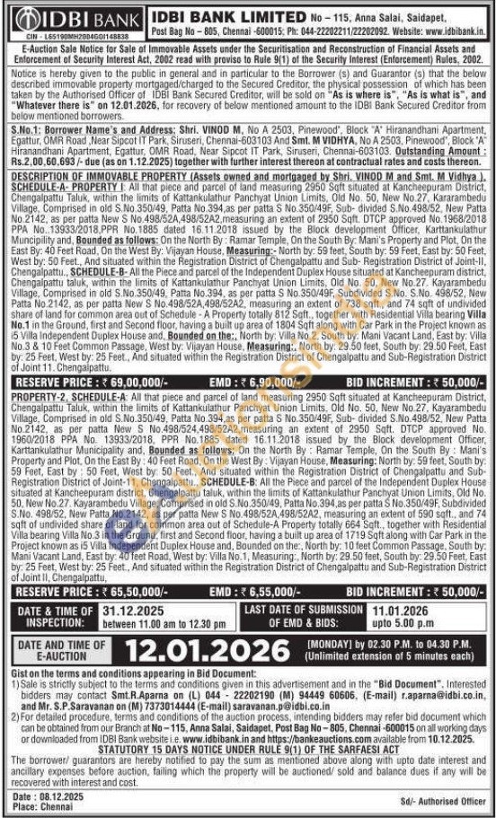 DESCRIPTION OF IMMOVABLE PROPERTY (Assets owned and mortgaged by Shri. VINOD M and Smt. M Vidhya), SCHEDULE-A-PROPERTY I: All that piece and parcel of land measuring 2950 Sqft situated at Kancheepuram District, Chengalpattu Taluk, within the limits of Kattankulathur Panchyat Union Limits, Old No. 50, New No.27, Kararambedu Village, Comprised in old S.No.350/49, Patta No.394, as per patta S No.350/49F, Sub- divided S.No. 498/52, New Patta No.2142, as per patta New S No.498/52A,498/52A2, measuring an extent of 2950 Sqft. DTCP approved No. 1968/2018 PPA No..13933/2018,PPR No.1885 dated 16.11.2018 issued by the Block development Officer, Karttankulathur Muncipility and, Bounded as follows: On the North By: Ramar Temple, On the South By: Mani's Property and Plot, On the East By: 40 Feet Road, On the West By: Vijayan House, Measuring:- North by: 59 feet, South by: 59 Feet, East by: 50 Feet, West by: 50 Feet., And situated within the Registration District of Chengalpattu and Sub-Registration District of Joint-II. Chengalpattu.. SCHEDULE-B- All the Piece and parcel of the Independent Duplex House situated at Kancheepuram district, Chengalpattu taluk, within the limits of Kattankulathur Panchyat Union Limits, Old No. 50, New No.27. Kayarambedu Village, Comprised in old S.No.350/49, Patta No.394, as per patta S No.350/49F, Subdivided S.No. S.No. 498/52, New Patta No.2142, as per patta New S No.498/52A,498/52A2, measuring an extent of 738 sqft., and 74 sqft of undivided share of land for common area out of Schedule-A Property totally 812 Sqft., together with Residential Villa bearing Villa No.1 in the Ground, first and Second floor, having a built up area of 1804 Sqft along with Car Park in the Project known as 15 Villa Independent Duplex House and, Bounded on the:, North by: Villa No.2, South by: Mani Vacant Land, East by: Villa No.3 & 10 Feet Common Passage, West by: Vijayan House, Measuring:, North by: 29.50 feet, South by: 29.50 Feet, East by: 25 Feet, West by: 25 Feet., And situated within the Registration District of Chengalpattu and Sub-Registration District of Joint 11. Chengalpattu