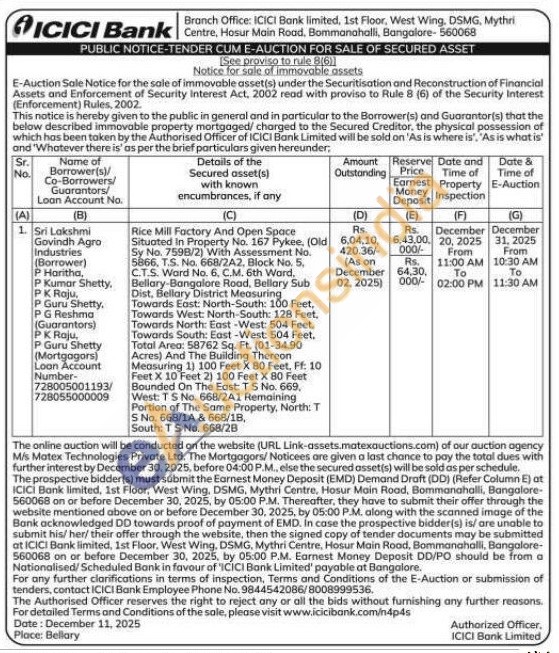 Rice Mill Factory And Open Space Situated in Property No. 167 Pykee. (Old Sy No. 7598/2) With Assessment No. 5866, T.S. No. 668/2A2, Block No. 5, C.T.S. Ward No. 6, C.M. 6th Ward. Bellary-Bangalore Road, Bellary Sub Dist, Bellary District Measuring Towards East: North-South: 100 Feet, Towards West: North-South: 128 Feet. Towards North: East-West: 504 Feet. Towards South: East-West: 504 Feet, Total Area: 58762 Sq. Ft. (01-34.90 Acres) And The Building Thereon Measuring 1) 100 Feet X 80 Feet, Ff: 10 Feet X 10 Feet 2) 100 Feet X 80 Feet Bounded On The East: TS No. 669, West: TS No. 668/2A1 Remaining Portion of The Same Property, North: T S No. 668/14 & 668/18, South: TS No. 668/28