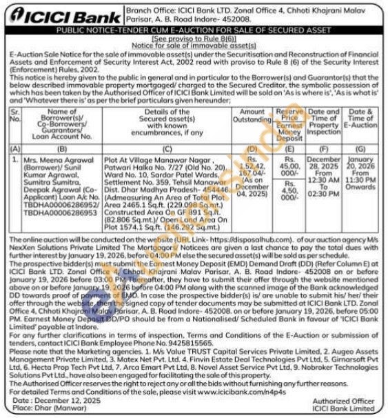 Plot At Village Manawar Nagar, Patwari Halka No. 7/27 (Old No. 20), Ward No. 10, Sardar Patel Words, Settlement No. 359, Tehsil Manawar Dist. Dhar Madhya Pradesh-454446. (Admeasuring An Area of Total Plot Areo 2465.1 Sq.ft. (229.098 Sq.mt.) Constructed Area On GF 891 Sq.ft. (82.806 Sq.mt.)/ Open Land Area On Plot 1574.1 Sq.ft. (146.292 Sq.mt.)