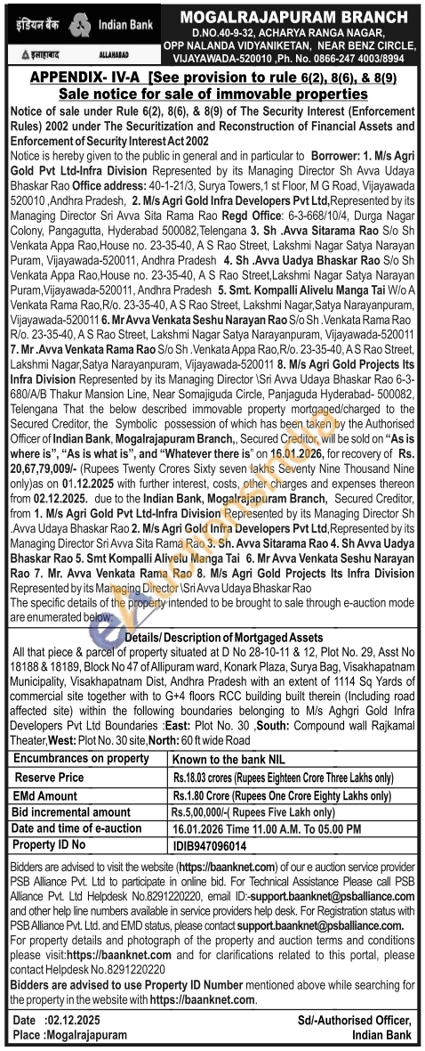 Details/Description of Mortgaged Assets : All that piece & parcel of property situated at D No 28-10-11 & 12, Plot No. 29, Asst No 18188 & 18189, Block No 47 of Allipuram ward, Konark Plaza, Surya Bag, Visakhapatnam Municipality, Visakhapatnam Dist, Andhra Pradesh with an extent of 1114 Sq Yards of commercial site together with to G+4 floors RCC building built therein (Including road affected site) within the following boundaries belonging to M/s Aghgri Gold Infra Developers Pvt Ltd Boundaries East: Plot No. 30 South: Compound wall Rajkamal Theater, West: Plot No. 30 site, North: 60 ft wide Road