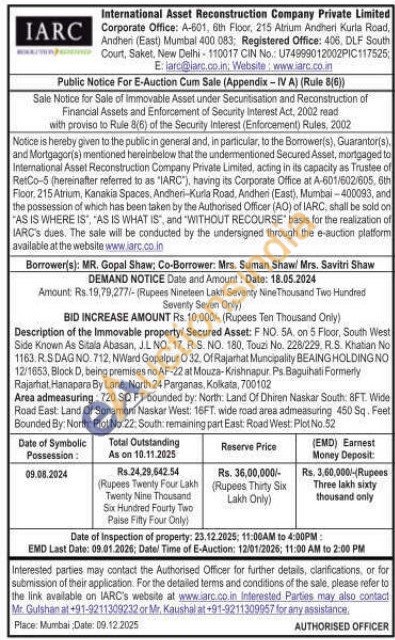 Description of the Immovable property/ Secured Asset: F NO. SA, on 5 Floor, South West Side Known As Sitala Abasan, J.L NO. 17. R.S. NO. 180, Touzi No. 228/229, R.S. Khatian No 1163. R.S DAG NO. 712, NWard Gopalpur O 32. Of Rajarhat Muncipality BEAING HOLDING NO 12/1653, Block D, being premises no AF-22 at Mouza-Krishnapur. Ps. Baguihati Formerly Rajarhat Hanapara By Lane, North 24 Parganas, Kolkata, 700102