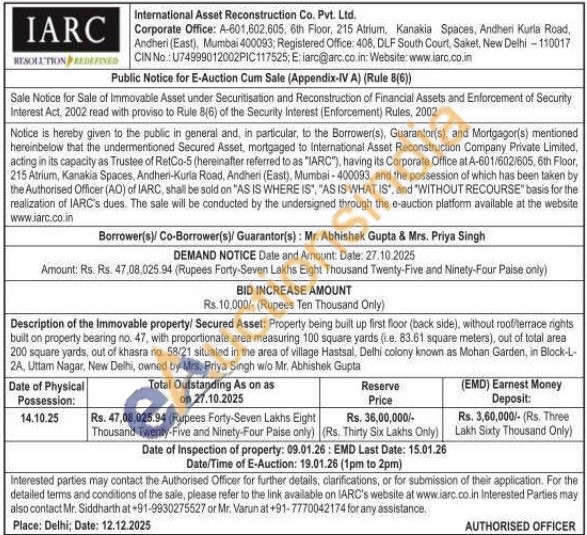 Description of the Immovable property/ Secured Asset: Property being built up first floor (back side), without roof terrace rights built on property bearing no. 47, with proportionate area measuring 100 square yards (ie. 83.61 square meters), out of total area 200 square yards, out of khasra no. 58/21 situated in the area of village Hastsal, Delhi colony known as Mohan Garden, in Block-L-2A, Uttam Nagar, New Delhi, owned by Mrs. Priya Singh w/o Mr. Abhishek Gupta