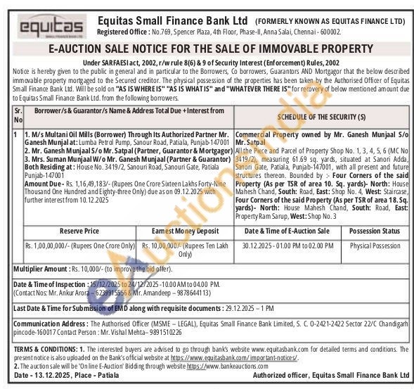 All the Piece and Parcel of Property Shop No. 1, 3, 4, 5, 6 (MC No 3419/2), measuring 61.69 sq. yards, situated at Sanori Adda, Sanori Gate, Patiala, Punjab-147001, with all present and future structures therean. Bounded by Four Corners of the said Property (As per TSR of area 10. Sq. yards)- North: House Mahesh Chand, South: Road, East: Shop No. 4, West: Staircase Four Corners of the said Property (As per TSR of area 18. Sq. yards)- North: House Mahesh Chand, South: Road, East: Property Ram Sarup, West: Shop No. 3
