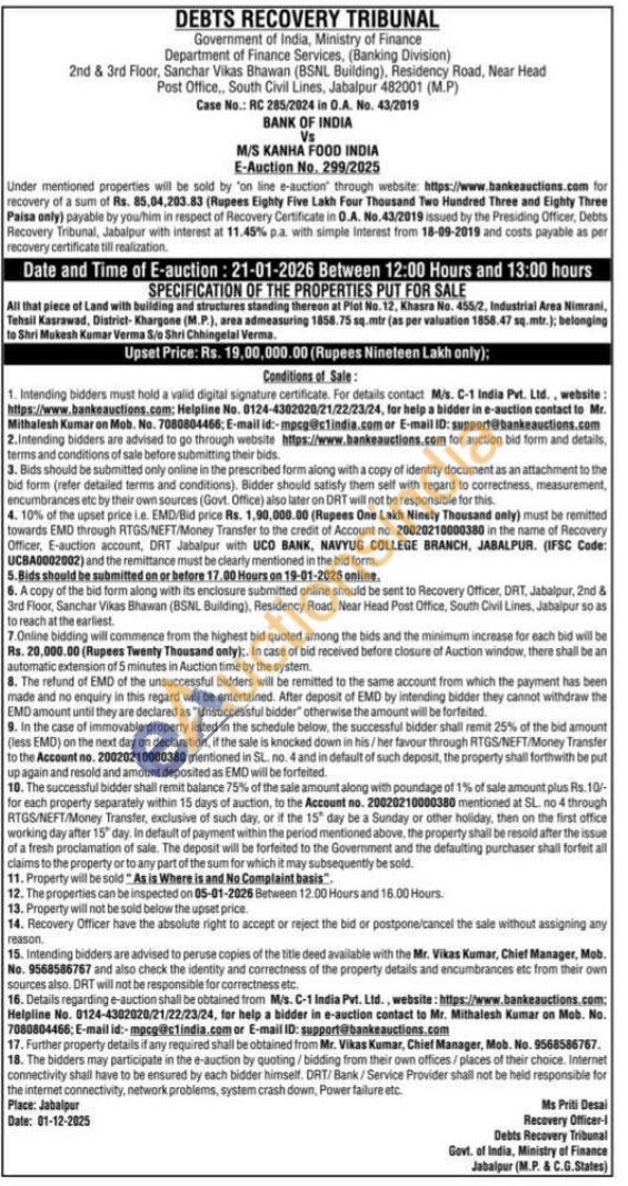 All that piece of Land with building and structures standing thereon at Plot No. 12, Khasra No. 455/2, Industrial Area Nimrani, Tehsil Kasrawad, District-Khargone (M.P.), area admeasuring 1858.75 sq. mtr (as per valuation 1858.47 sq.mtr.); belonging to Shri Mukesh Kumar Verma Sio Shri Chhingelal Verma.