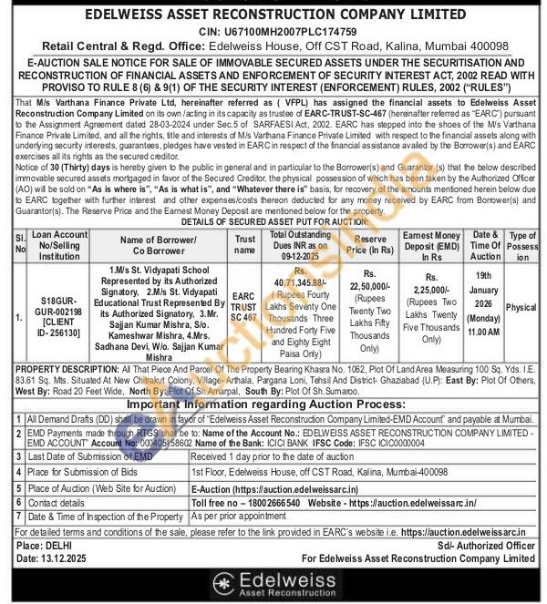 PROPERTY DESCRIPTION: All That Piece And Parcel Of The Property Bearing Khasra No. 1062, Plot Of Land Area Measuring 100 Sq. Yds. I.E. 83.61 Sq. Mts. Situated At New Chitrakut Colony, Village-Arthala, Pargana Loni, Tehsil And District- Ghaziabad (U.P): East By: Plot Of Others, West By: Road 20 Feet Wide, North By: Plot Of Sh Amarpal, South By: Plot Of Sh. Sumarco.