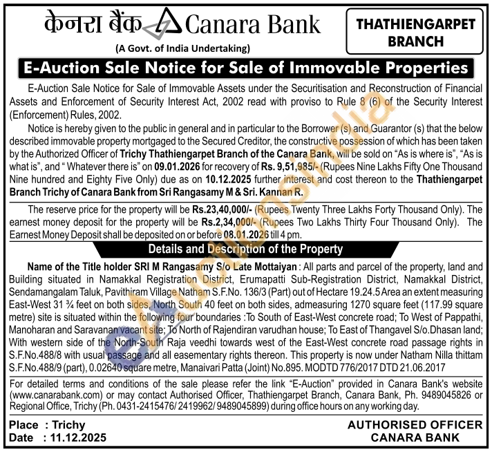 Name of the Title holder SRI M Rangasamy S/o Late Mottaiyan: All parts and parcel of the property, land and Building situated in Namakkal Registration District, Erumapatti Sub-Registration District, Namakkal District, Sendamangalam Taluk, Pavithiram Village Natham S.F.No. 136/3 (Part) out of Hectare 19.24.5 Area an extent measuring East-West 31 3/4 feet on both sides, North South 40 feet on both sides, admeasuring 1270 square feet (117.99 square metre) site is situated within the following four boundaries: To South of East-West concrete road; To West of Pappathi, Manoharan and Saravanan vacant site; To North of Rajendiran varudhan house; To East of Thangavel S/o.Dhasan land; With western side of the North-South Raja veedhi towards west of the East-West concrete road passage rights in S.F.No.488/8 with usual passage and all easementary rights thereon. This property is now under Natham Nilla thittam S.F.No.488/9 (part), 0.02640 square metre, Manaivari Patta (Joint) No.895. MODTD 776/2017 DTD 21.06.2017
