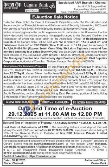 All that Piece and Parcel of Godown in land, R.S. No.27/6, Cadastre No. 207/1/3, measuring Godown Area 164.538 Sq.M., Entrance Area 72.07 Sq.M., Vacant Site on the Northern Side of the Godown 2.12 Sq.M., totaling 238.728 Sq.M., out of which a piece of land measuring 23.427 Sq.M., situated in the middle southem portion of that piece of land forming part of R.S. No. 27/6 lying on the eastern Border has been sold out vide Sale Deed No. 147/2004 dated 23.02.2004 regd in book 1, Vol.512, page 217 to 223 at SRO, Mahe and hence the remaining land available is 215.301 Sq.M. Direction As per Document: North: Cemetery Road. South Remaining portion of land and building, East: Remaining portion of the building & Main road, West: Remaining portion of land and building